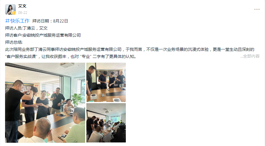 艾文陪同拜访安徽皖投产城时,亲眼见证了客户成功部丁清云对 “数字化考勤工具适配难题” 的精准应对。面对客户 “操作懵、不敢动” 的焦虑,丁清云没有急于推进流程,而是从开机连接的基础步骤手把手教学,用 “消除顾虑” 的细致替代 “完成任务” 的敷衍;谈及增购升级时,她先共情 “16 个项目点数据难汇总” 的痛点,再匹配专业解决方案,用 “留足决策空间” 的尊重替代 “单向推销” 的急躁。这种 “以客户需求为锚点” 的服务姿态,让艾文深刻领悟到:霍迹的专业,是把客户的困惑当成自己的课题,把客户的隐性需求转化为显性价值。