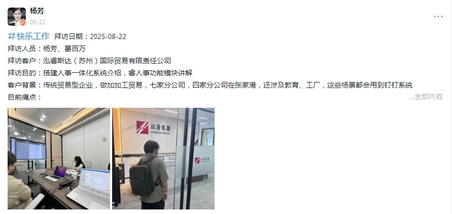 杨芳在泓睿斯达的拜访中,则感受到了霍迹 “全链条响应” 的责任担当。面对这家横跨贸易、教育、工厂多场景的企业 “流程不通、绩效低效、招聘分散” 的痛点,苏州负责人晏百万以 “痛点拆解 + 价值匹配” 的沟通建立信任,线上售前团队以 “即时响应 + 精准解答” 打消疑虑。这种 “前线攻坚 + 后方护航” 的协同服务,让杨芳清晰看到:霍迹对客户的负责,是从需求对接至方案落地的全周期坚守,是让每个环节都充满专业温度的承诺兑现。