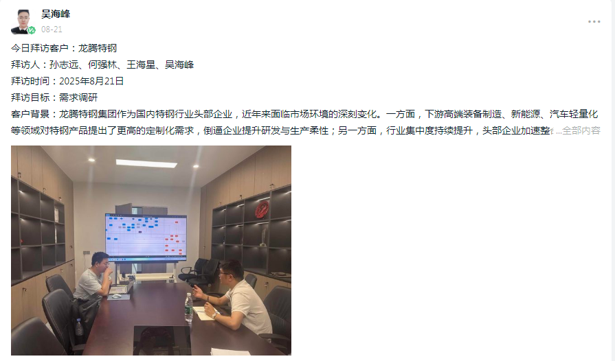 吴海峰在龙腾特钢的需求调研更显 “深耕细作” 的责任底色。作为特钢行业头部企业,龙腾正面临 “定制化需求升级 + 行业竞争加剧” 的双重挑战,数字化转型迫在眉睫。吴海峰与团队扎根四大分公司,逐环节梳理销售、宿舍等业务流程,把 “模糊需求” 转化为 “清晰清单”,为转型方案筑牢根基。这种 “深入产业肌理” 的调研态度,正是霍迹 “为客户量身定制转型路径” 的责任体现 —— 不做泛泛而谈的方案,只做真正解决问题的伙伴。