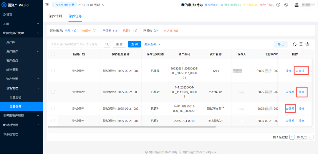 点击【提交】,计划状态变为“进行中”,立即生成保养任务(任务名称规则:保养计划名称+年月日+3 位流水号,如“生产车间季度保养-20251001-001”)。