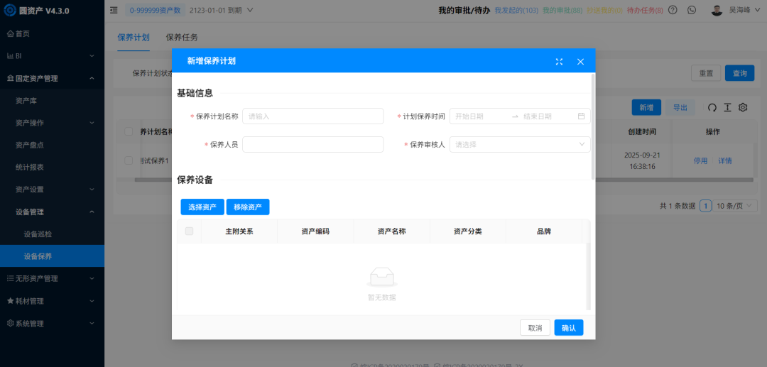 进入圆资产 PC 端「设备管理-设备保养-保养计划」,点击【新增】,填写保养计划名称(必填且唯一,如“生产车间季度设备保养”);