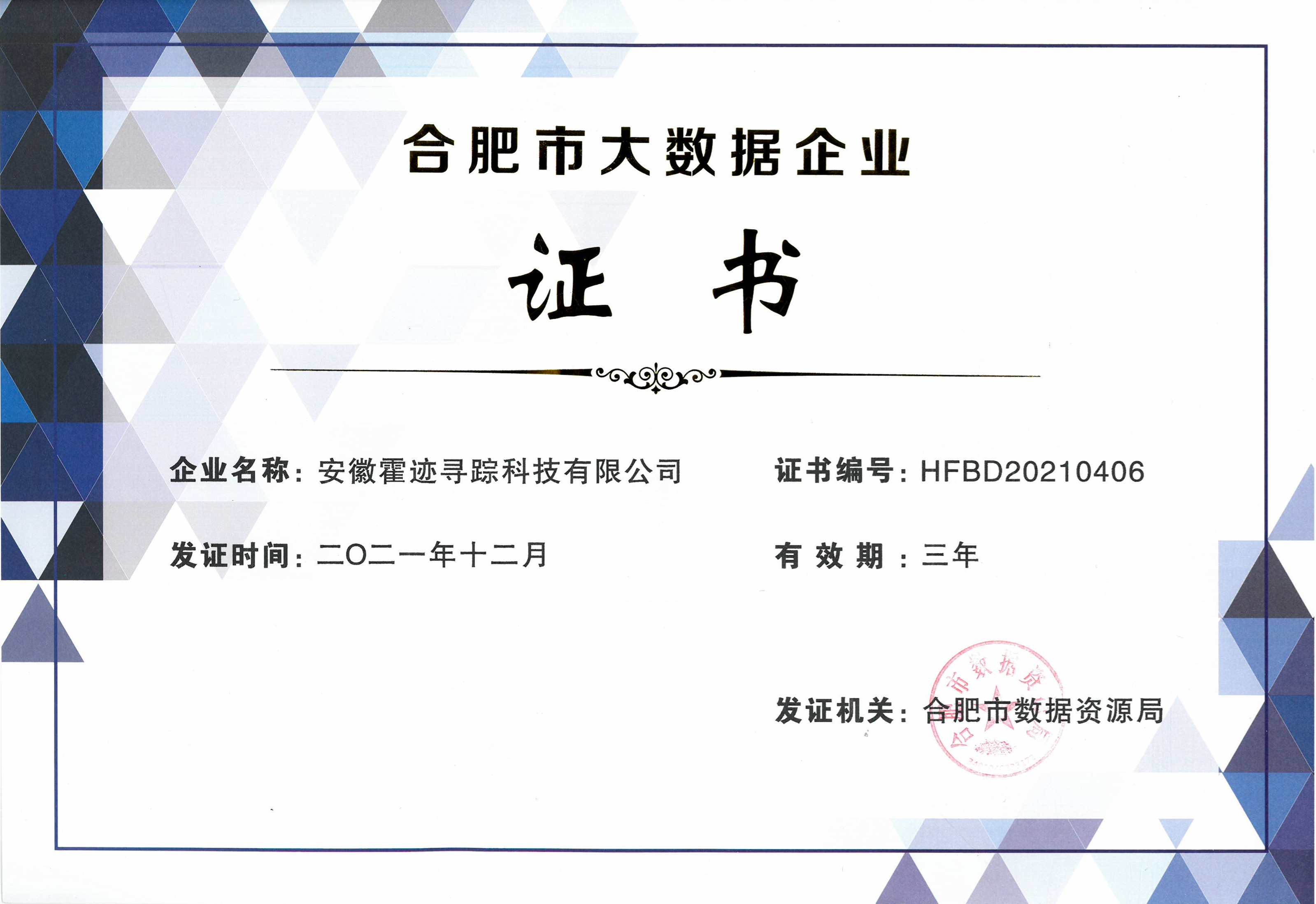 2021年12月,安徽霍迹寻踪科技有限公司荣获《合肥市大数据企业》证书,象征着霍迹寻踪在大数据方面的努力得到了合肥市数据资源局以及大数据市场的肯定,也是对相关机构对霍迹寻踪全体工作人员的鼓励。