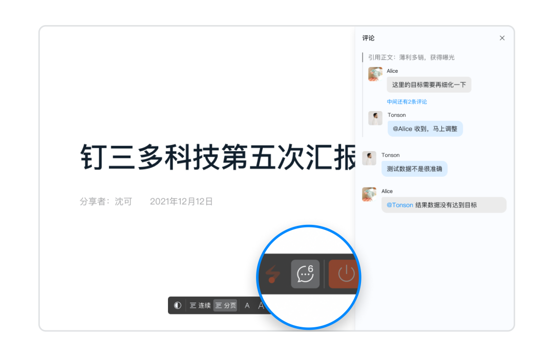 使用文档开启演示模式,新增支持「查看文档评论」。汇报过程可围绕评论深入讨论、分析,高效解决分歧,达成共识,让你的汇报收获满满。