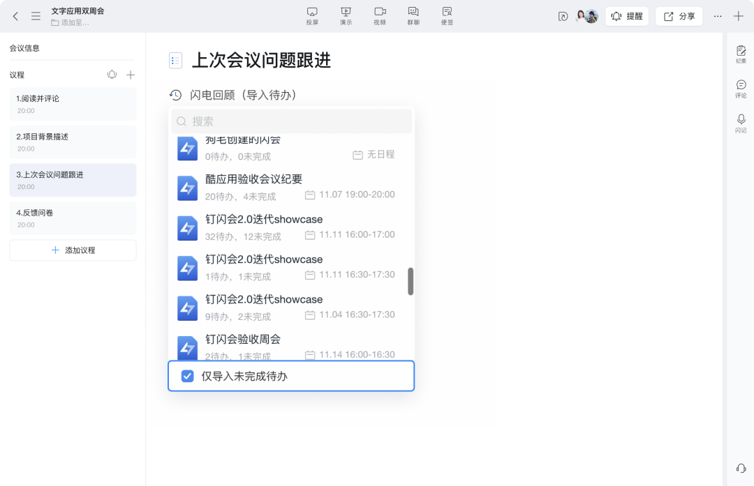 会议中需要检查任务状态,用闪回回顾导入待办,现支持「仅导入未完成待办」,只针对未完成的任务进行回顾与讨论,高效推进会议进程,节省时间提升会议效率。