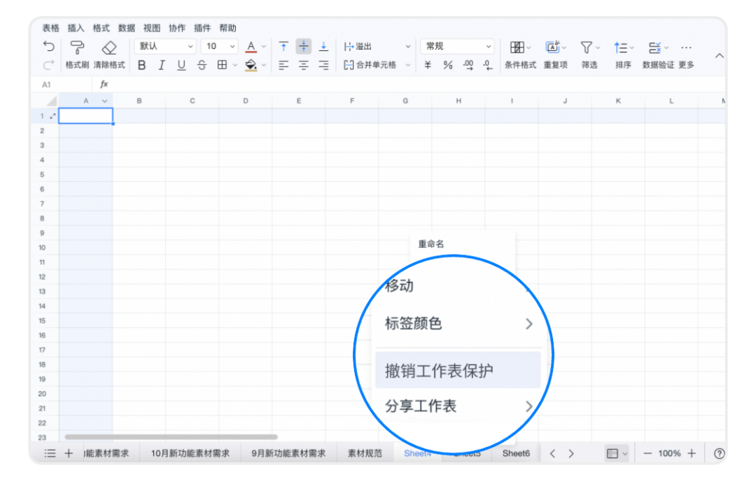 命中自研编辑时,若表格中有工作表保护,右键工作表,提示可以撤销工作表保护