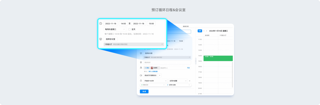 循环日程支持添加单个会议室,项目例会、周会省心预约,日程自动同步到设备快速一键入会。