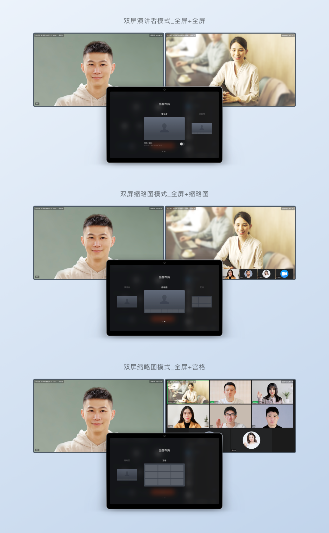 双屏场景支持全屏+全屏、全屏+画廊、全屏+宫格三种布局方式,满足不同会议需求。