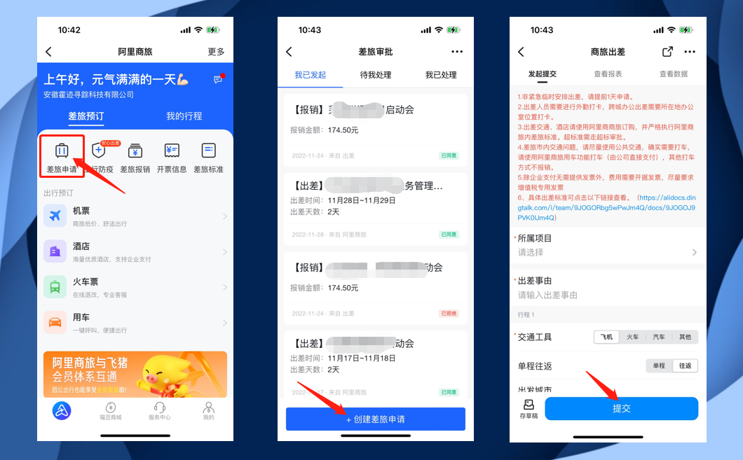 打开钉钉,找到阿里商旅应用,在这里根据情况发起出差申请,待申请通过后,即可根据该条出差审批,进行专款专项的报销以及直接消费操作。