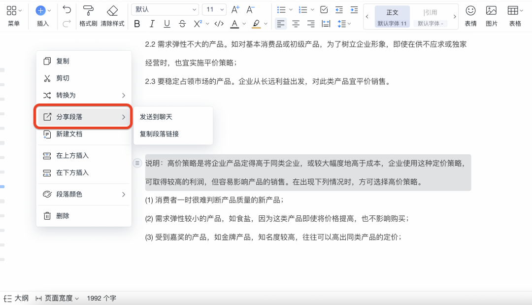 此外,文段还支持分享哦,点击顶端【菜单】-【分享段落】,即可将该段文字直接分享给他人查看。
