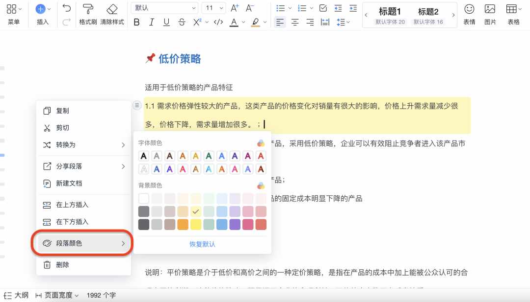 如果想要突出文档重点,提升可读性,点击顶端【菜单】-【段落颜色】,该段文字背景即被填充。