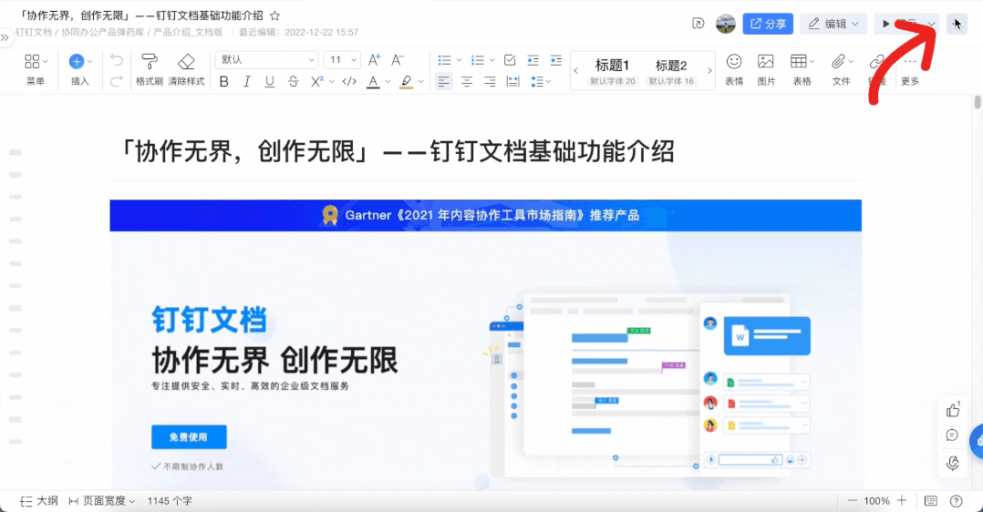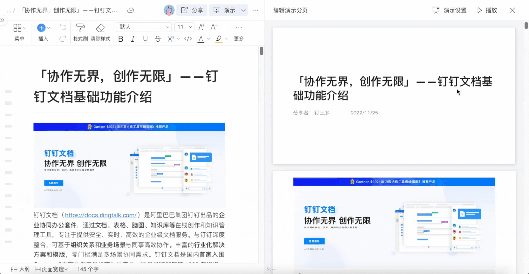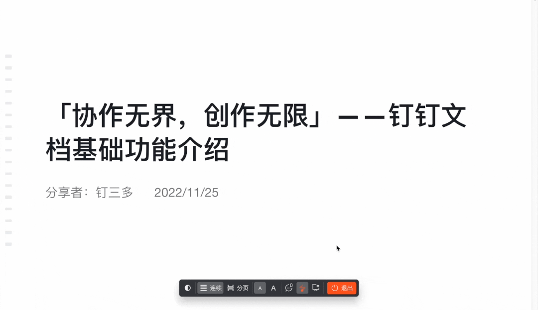 汇报时,多人编辑文档无法正确显示主讲人?钉钉文档演示模式下,点击下方工具栏【演示设置】,可以自定义修改分享者名称,也可设置不显示。