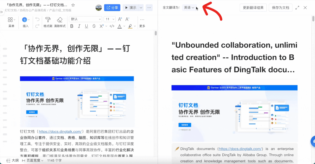 在处理国际业务时,你还在花时间逐句翻译产品文档吗?不用那么麻烦,钉钉文档与达摩院-机器智能技术自然语言团队联手,文档翻译能力全新升级,支持「全文翻译」,可以实现21国语言互译,让沟通协作更高效!