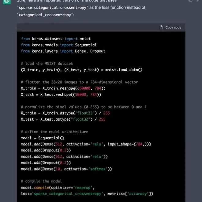 小哥让ChatGPT构建一个神经网络,使用 Keras 解决 MNIST 问题。ChatGPT竟顺利完成了,还能按小哥的思路进行修改和升级,小哥对ChatGPT输出的代码叶给予了评价:堪称完美!