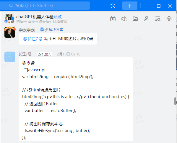 不光如此,我们还将ChatGPT机器人搬到了钉钉对话框中,让ChatGPT可以在钉钉上随时为您解答问题:
