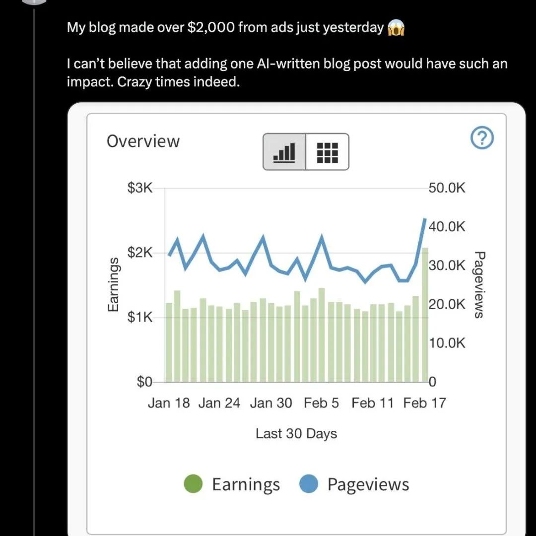 小姐姐将ChatGPT写出的一篇文章发布到博客,这篇AI博文逻辑清晰数据明晰,给小姐姐带来了日入过万的可观收入