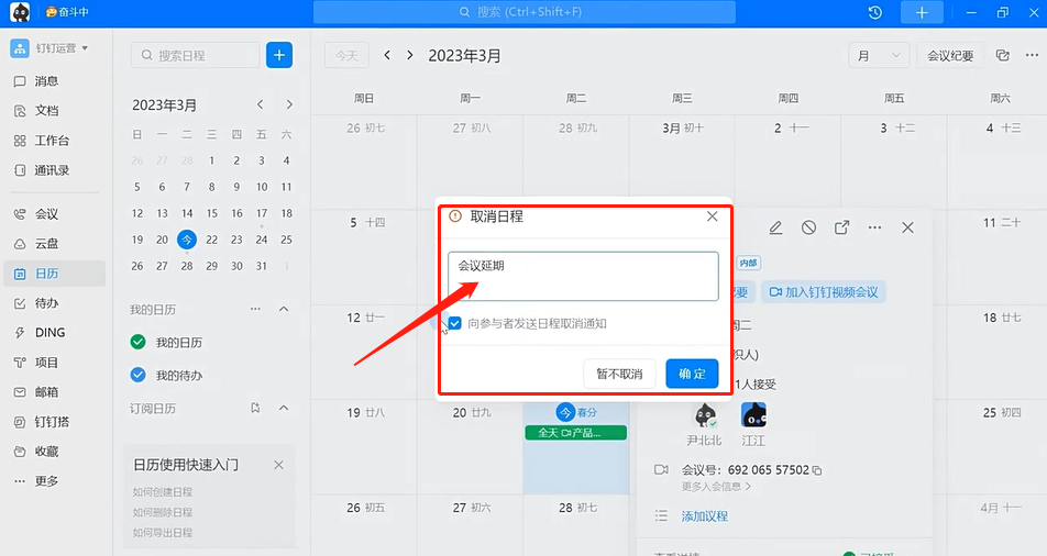 预约好的日程有时需要临时取消?钉钉日历优化升级,组织人在取消日程的弹窗中,可以编辑日程取消的原因,参与人可以在日程详情页评论区进行查看。