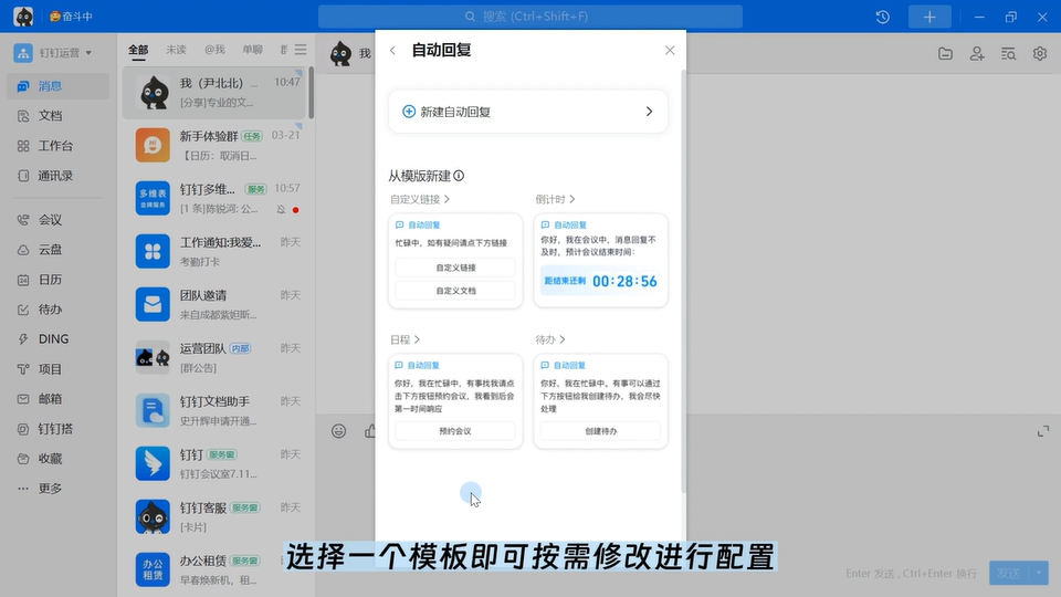 工作状态内的自动回复全面升级,支持插入包含待办、预约会议、倒计时等丰富功能样式的卡片,链接、字体颜色都能轻松搞定,让你的自动回复与众不同。