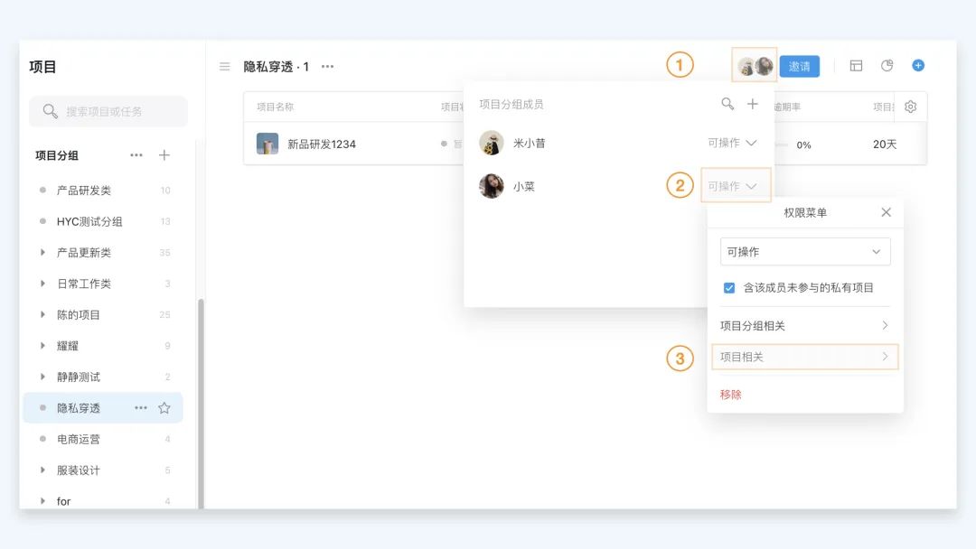 我们可以在项目分组管理项目分组成员的权限,我们可以为他设置「查看项目内隐私内容」权限,这样他就可以查看项目的所有隐私内容,实现隐私穿透。