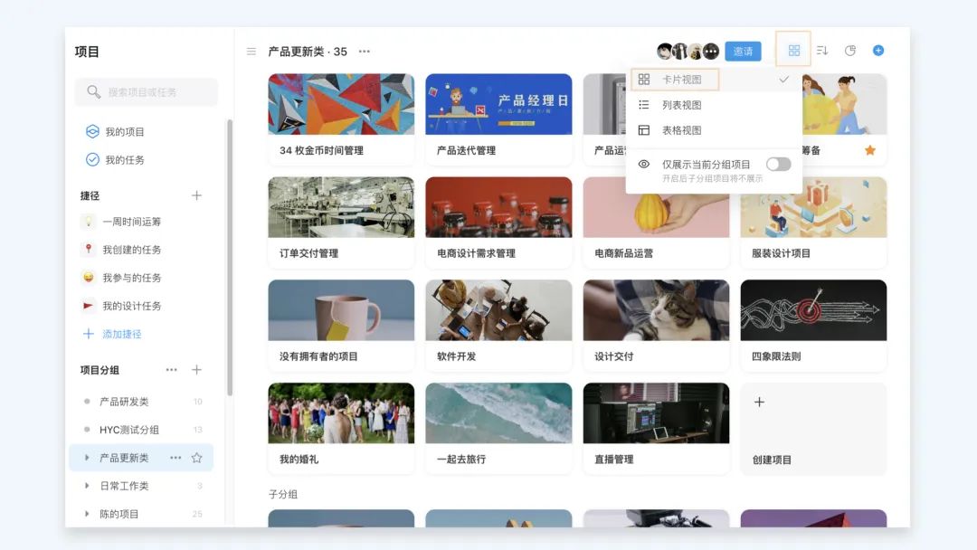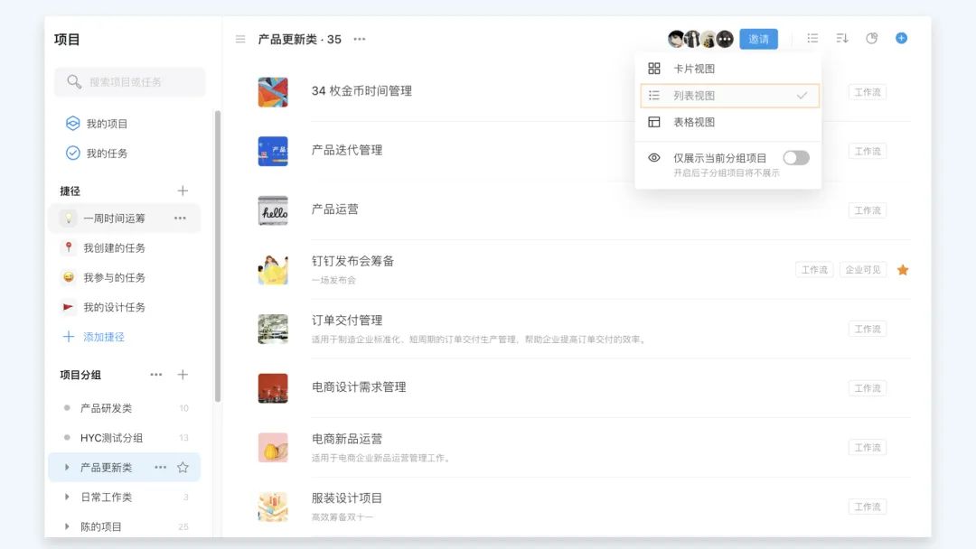 为了方便企业管理员纵览全局,我们提供了看板、列表、表格三种视图查看项目分组的内容。