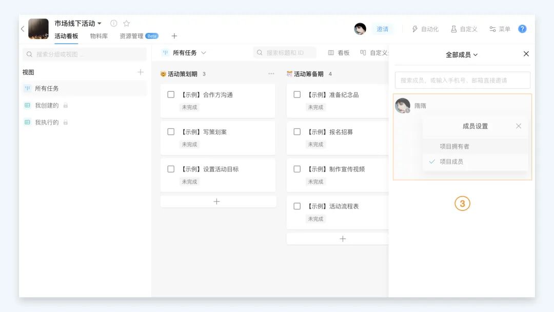 企业拥有者进入项目后,在成员设置中将自己设为「项目拥有者」,就可以进行项目管理了!