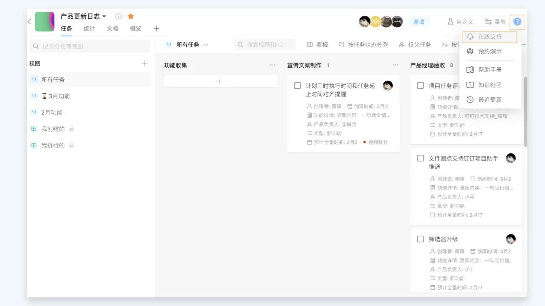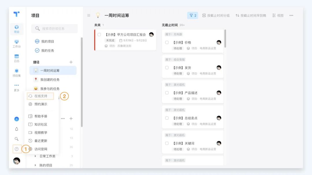 或者在项目详情页点击右上角问号标识,找到在线支持,与我们连线寻求帮助。