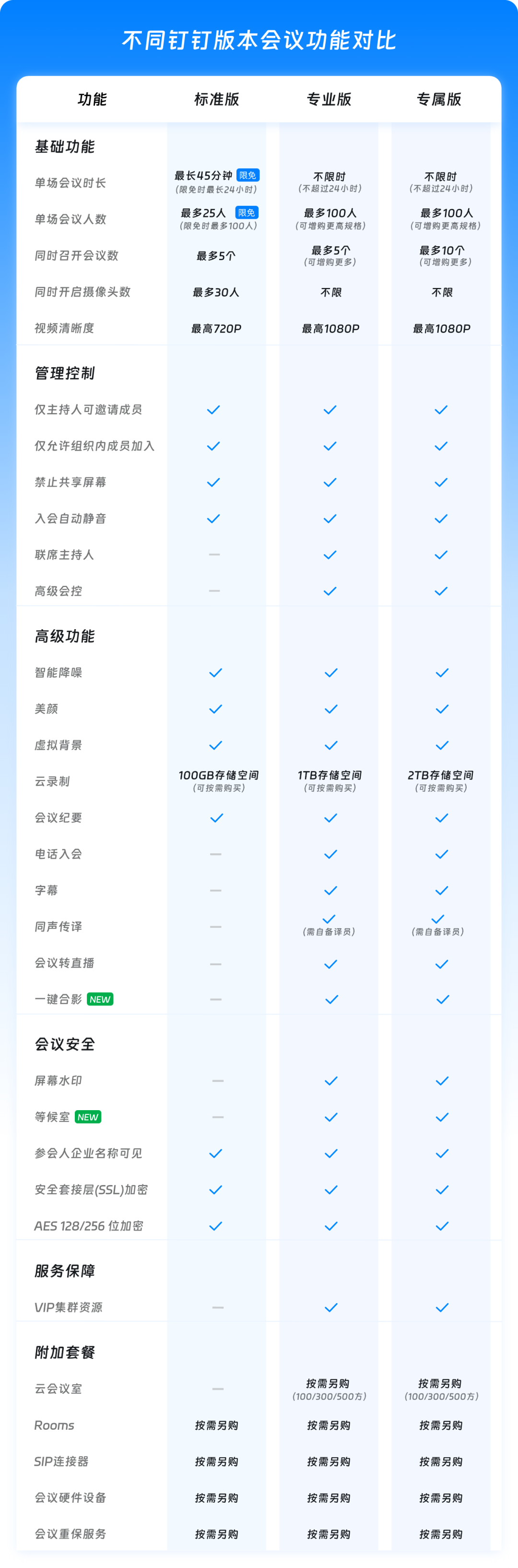 目前钉钉推出了三个版本供您选择:标准版、专业版和专属版。我们为每个版本提供了不同功能权益的视频会议服务。
