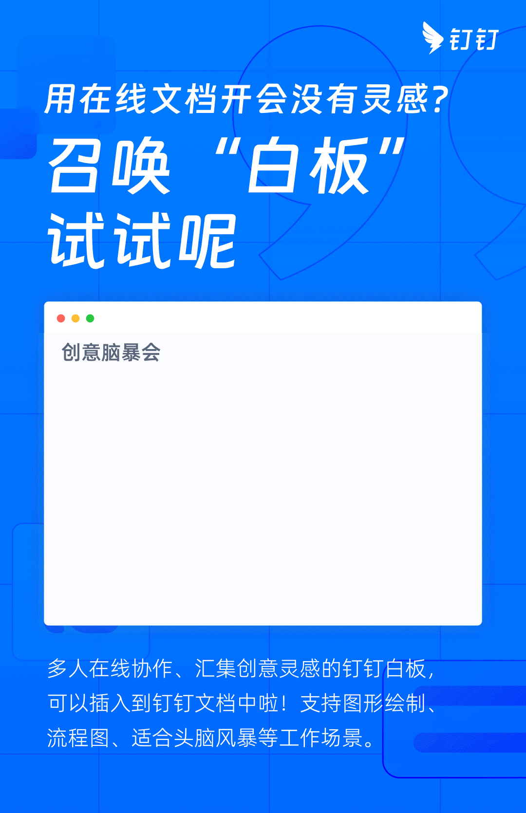 多人在线协作、汇集创意灵感的钉钉白板,可以插入到钉钉文档中。支持图形绘制、流程图、头脑风暴等使用场景;