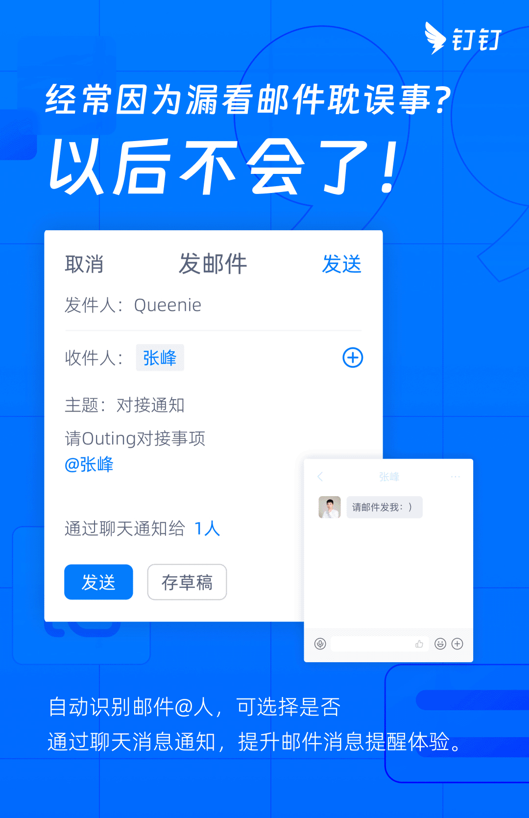 自动识别邮件@人,可选择是否通过聊天消息通知,提升邮件消息提醒体验;