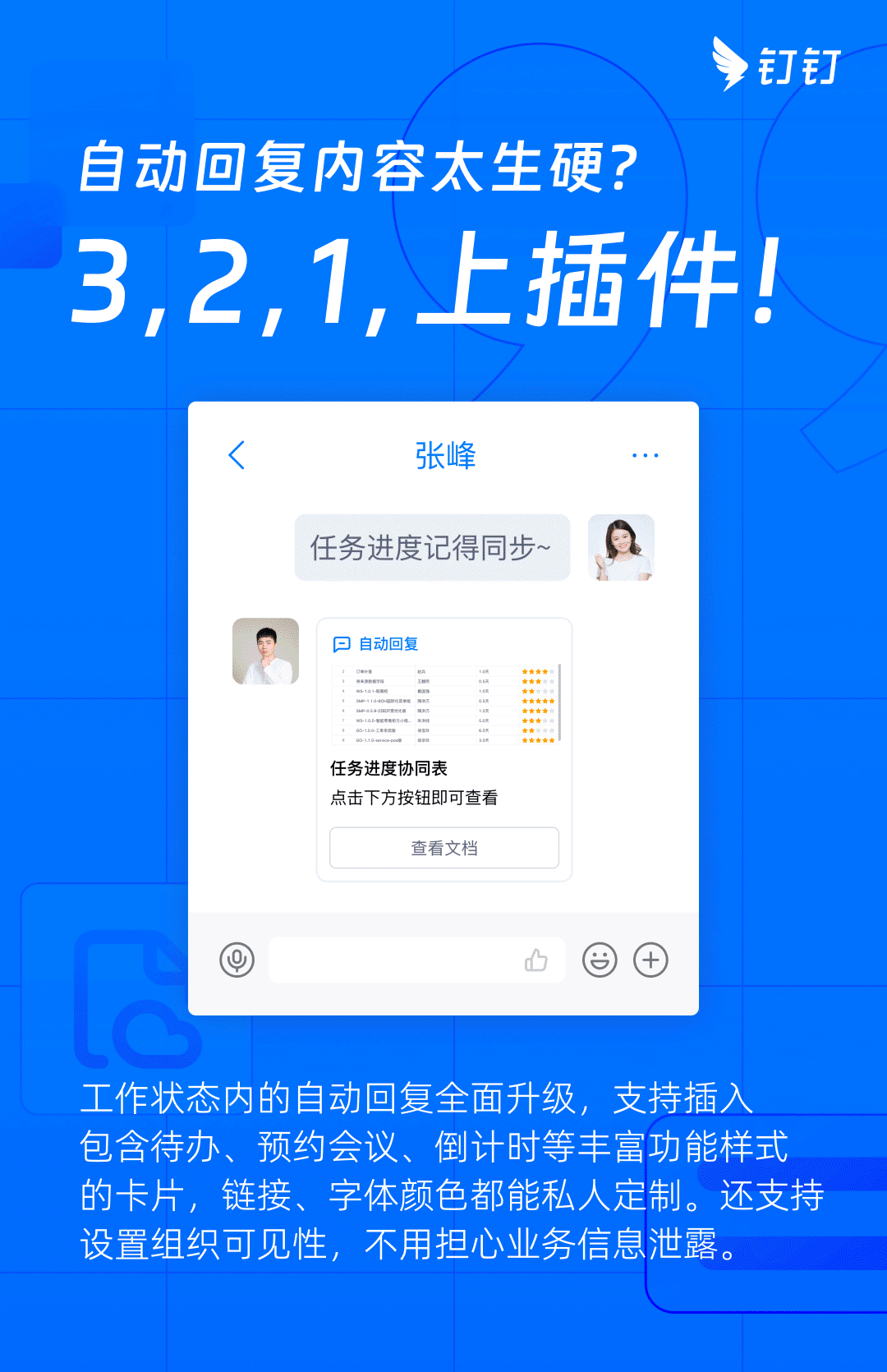 工作状态内的自动回复全面升级,支持插入包含待办、预约会议、倒计时等丰富功能样式的卡片,链接、字体颜色都能私人定制;