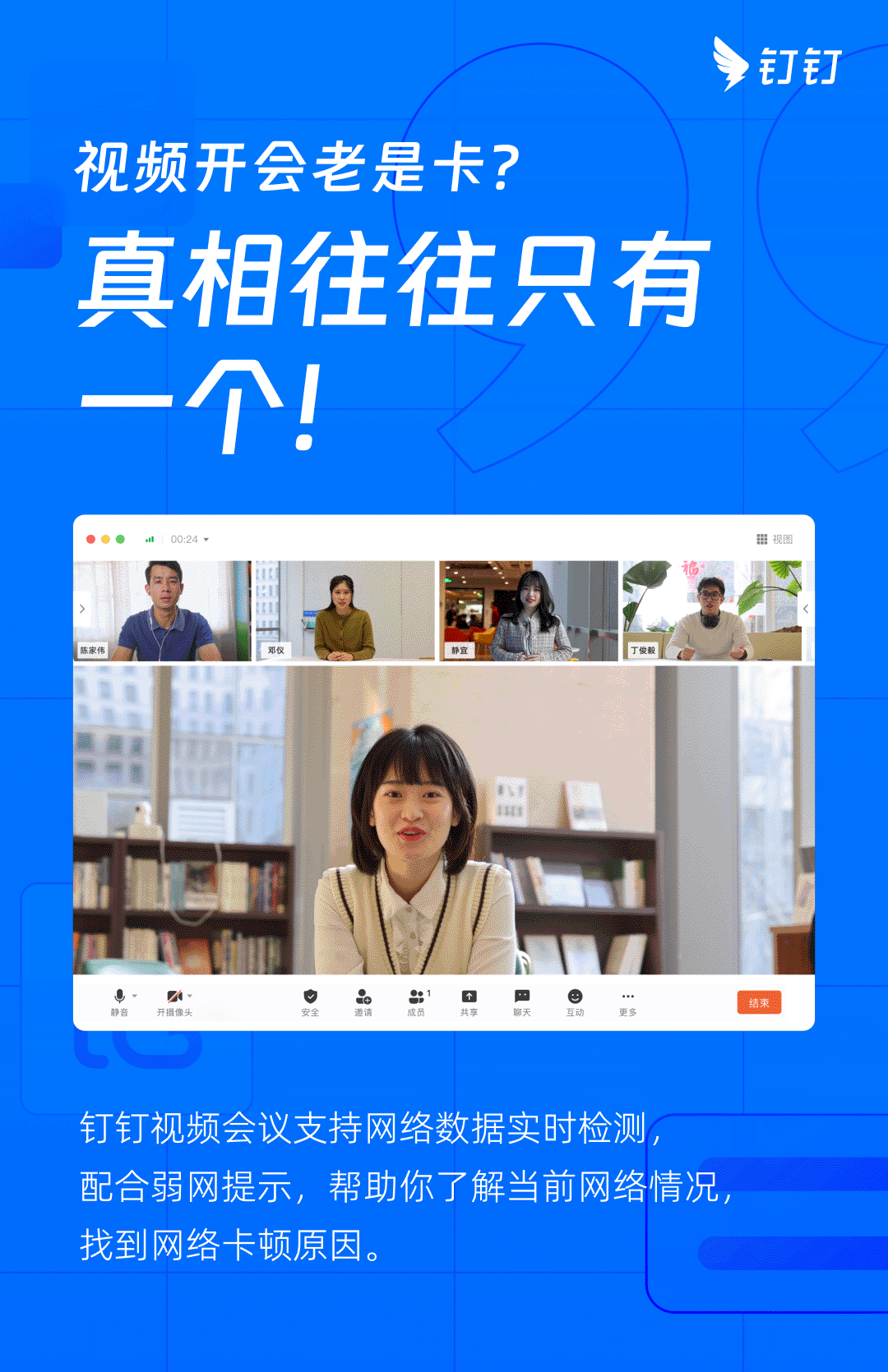 钉钉视频会议支持网络数据实时检测,配合弱网提示,帮助你了解当前网络情况,找到网络卡顿原因。