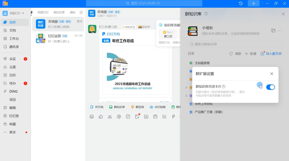 群知识库新增知识贡献吊顶卡片,清晰展示群知识库贡献值排名,激发群成员创造力。