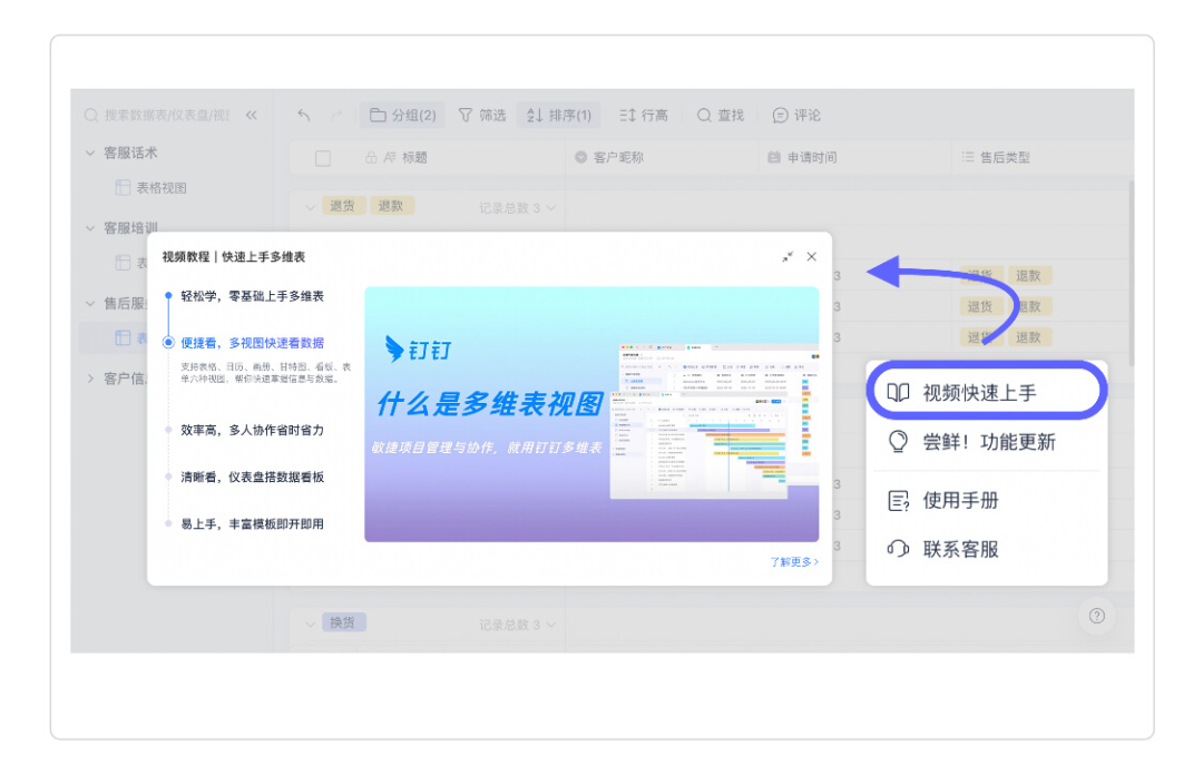 钉钉多维表「客服与帮助」全新升级,支持查看新手视频、功能更新、产品手册,人工客服在线答疑,帮助快速上手产品功能。