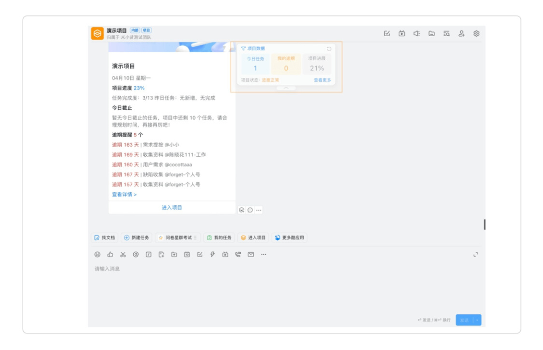 群吊顶数据支持每 24 小时自动刷新一次,提高了群吊顶的数据时效性,帮助管理者随时了解项目动态。