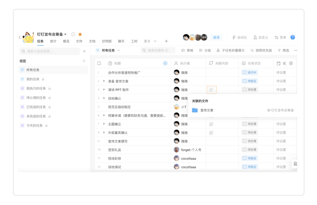 表格视图支持点击关联内容的图标快捷查看内容,大大提高了查看任务关联资源的效率。