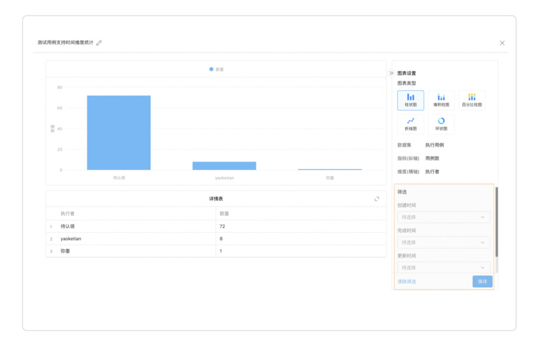 「执行用例」支持选择「创建时间」、「完成时间」、「更新时间」三个筛选字段,从时间维度分析测试用例的执行情况。