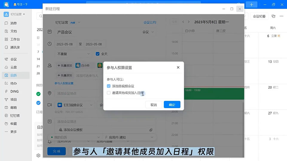 日程组织人可开启或关闭参与人「邀请其他成员加入日程」权限,提升会议信息安全性和管控能力。
