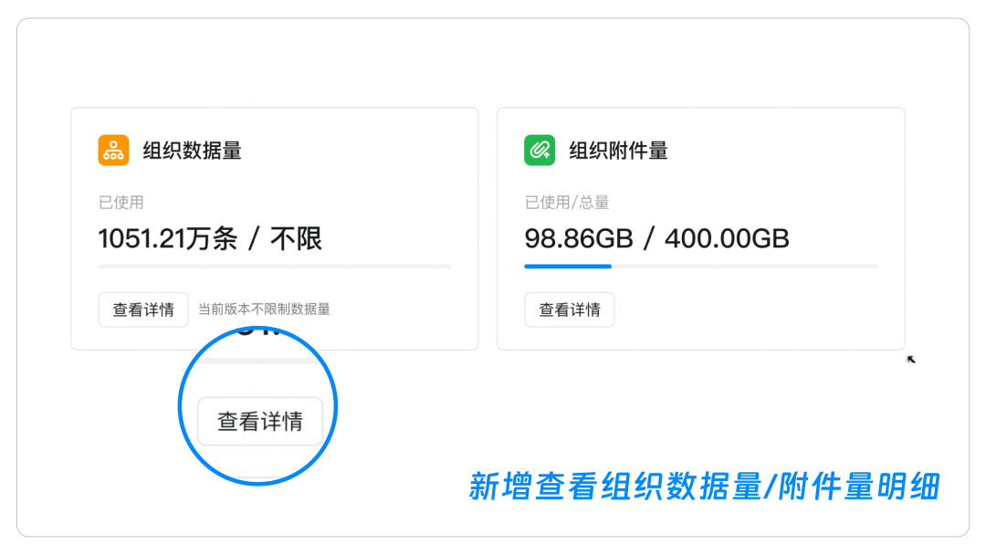 新增「组织数据量和附件量支持明细分析」,组织用量一目了然,便于资源治理。