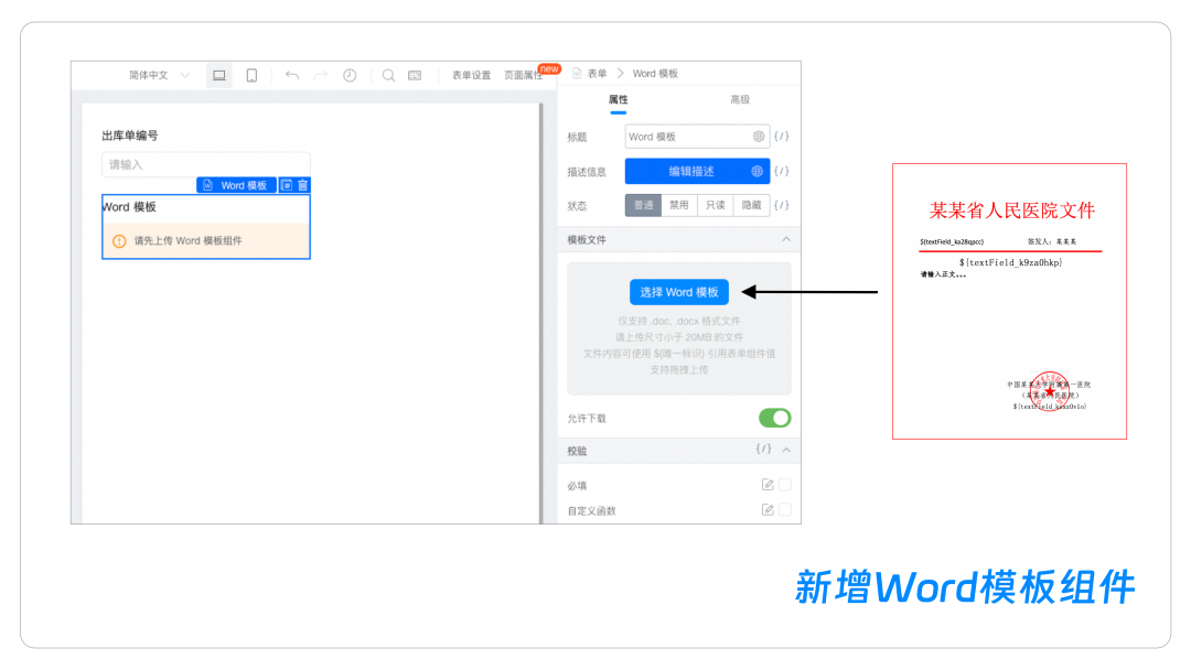新增「Word模板组件」,可基于表单内容生成Word附件,适用于标准格式文本生成场景。