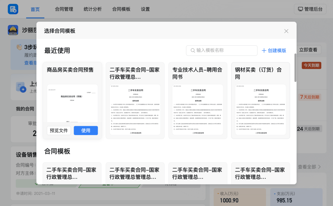 同时,钉钉智能合同还支持企业法务人员直接上传常用模板,并对模板内容保持迭代,防止业务人员自己保留一份,版本没及时更新,无法控制风险,也花费更多审核人力。