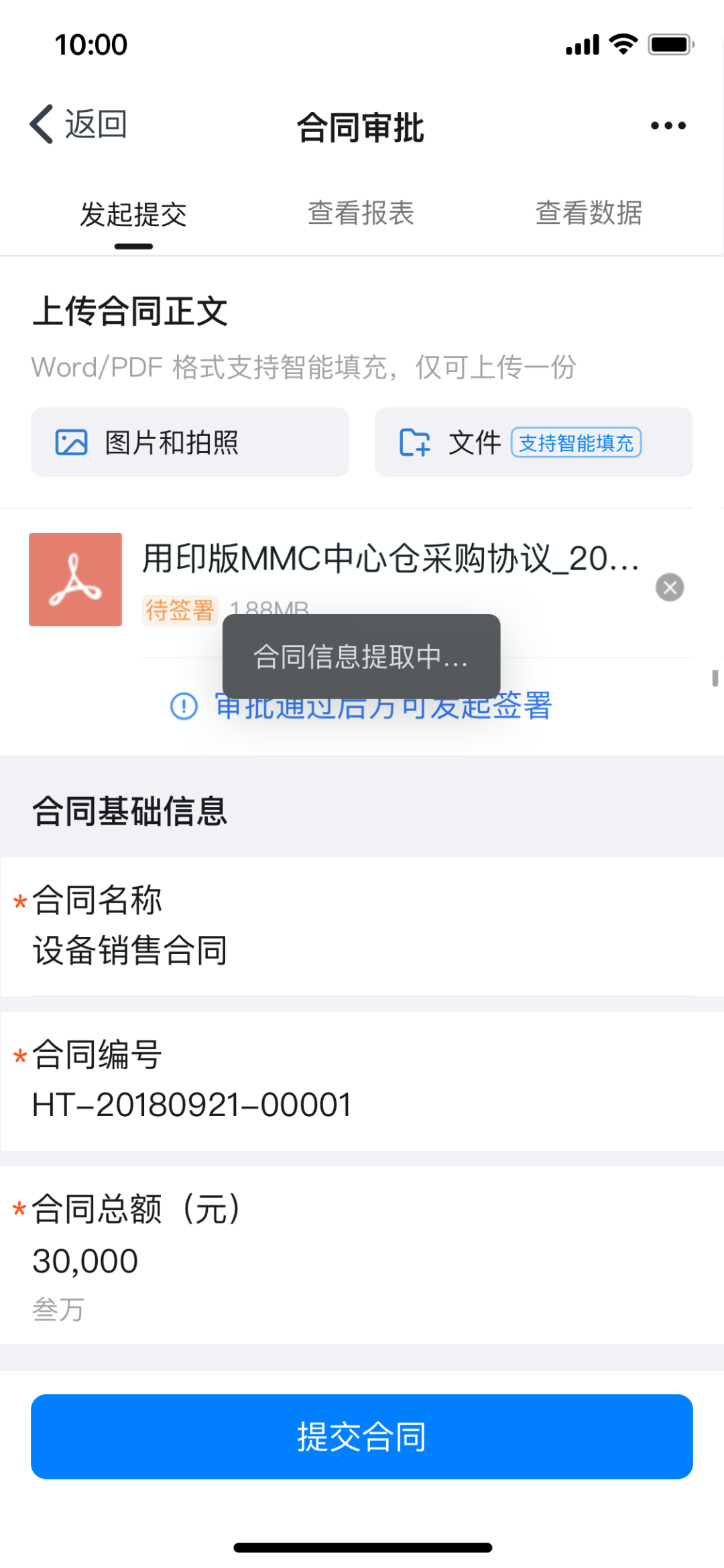 为了大大减轻人员的统计工作量,钉钉智能合同还引入了 NLP 技术,按照合同标题、部分、日期等,为合同智能分组,并支持智能提取合同中的关键数据形成报表,让企业经营数据一目了然。