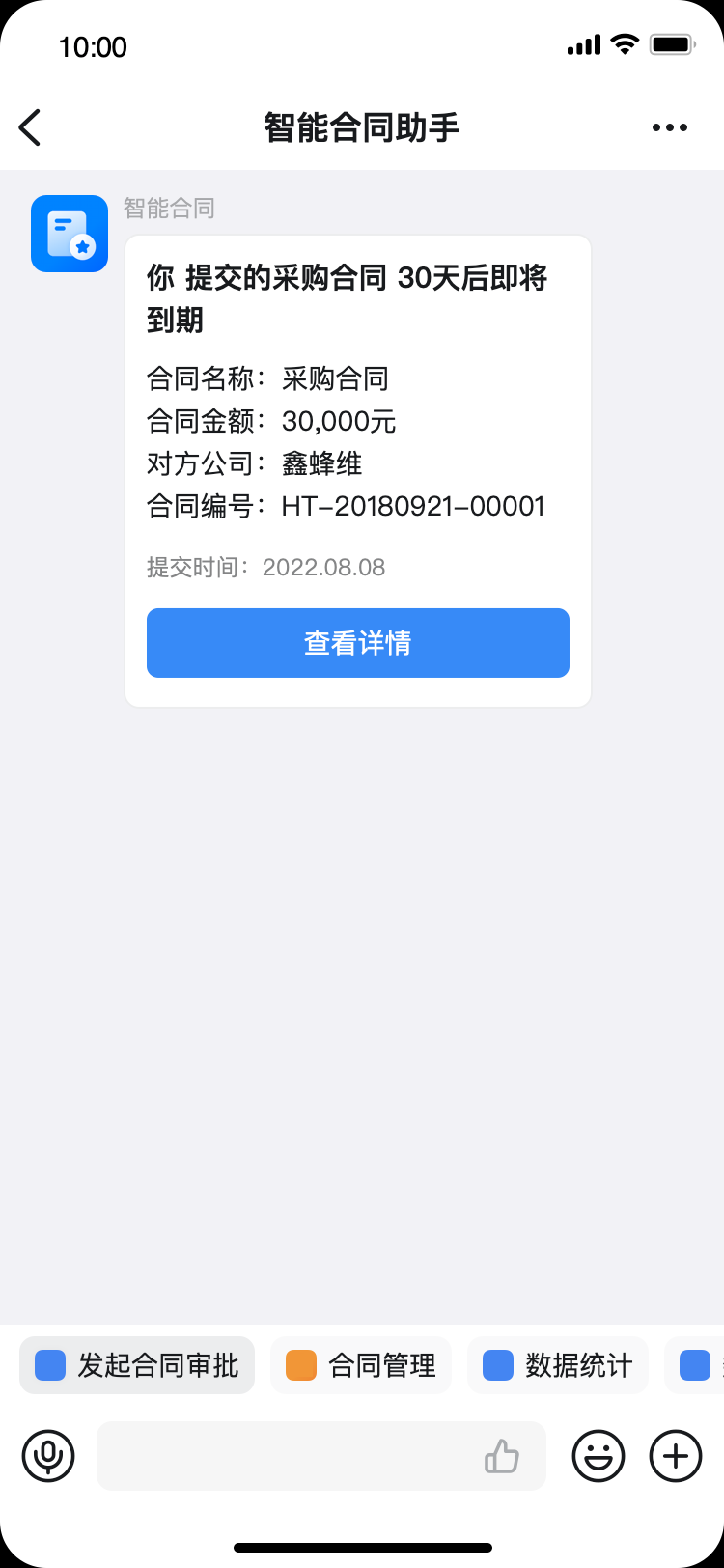 针对合同履约情况可设置统一管控,法务或业务人员可实时监控每份合同的履约情况。当合同即将到期时,合同助手还会及时进行提醒,减少损失,规避风险。