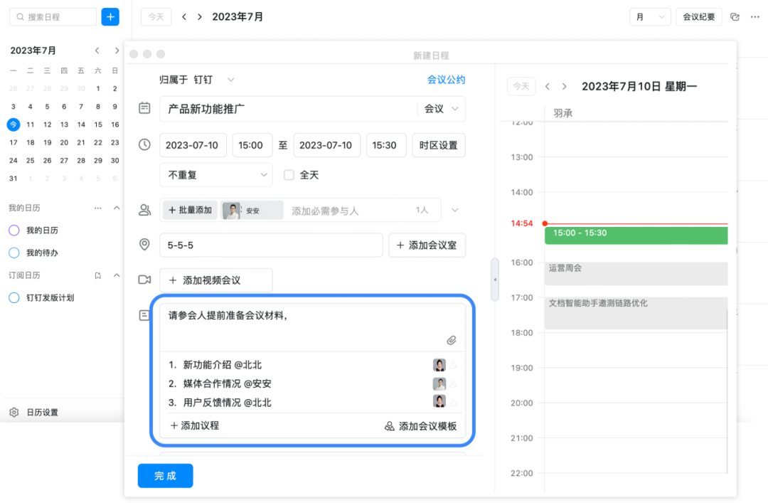日程创建时可添加议程,支持输入议程标题,并 @ 提示负责人准备好议题材料,省去重复操作,保障会议高效进行。