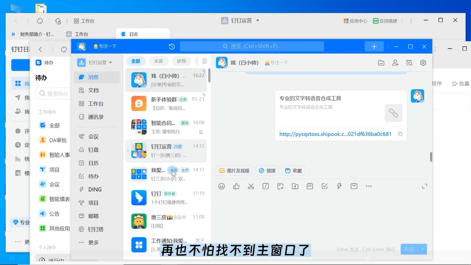 同一个组织的文档、工作台应用支持在同一个容器中打开,打开妙聚窗口后,可一键将聊天窗口激活在桌面最前端,再也不怕找不到主窗口了。