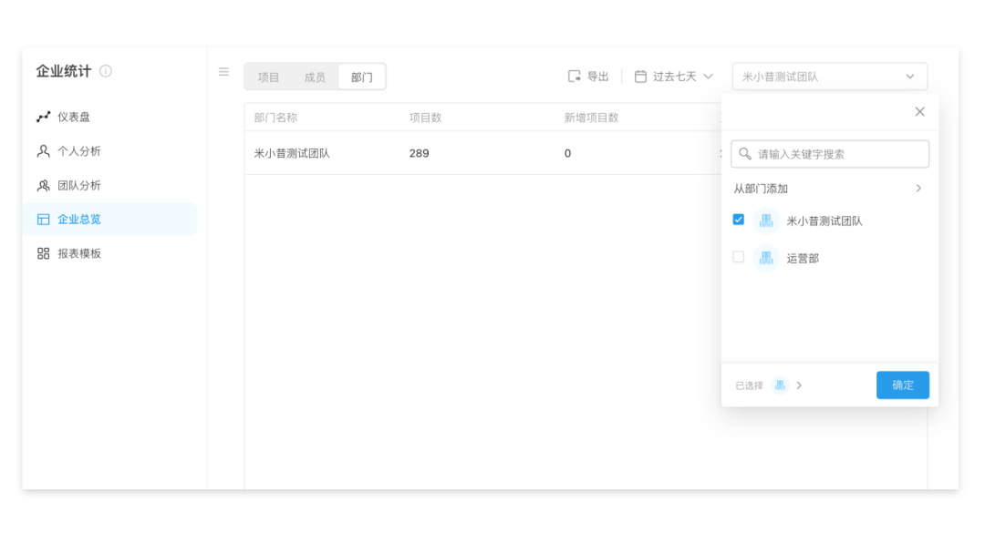 企业统计新增部门统计维度,覆盖更多统计场景。可通过「企业统计—企业总览—部门」,查看企业一级部门的项目任务汇总数据。