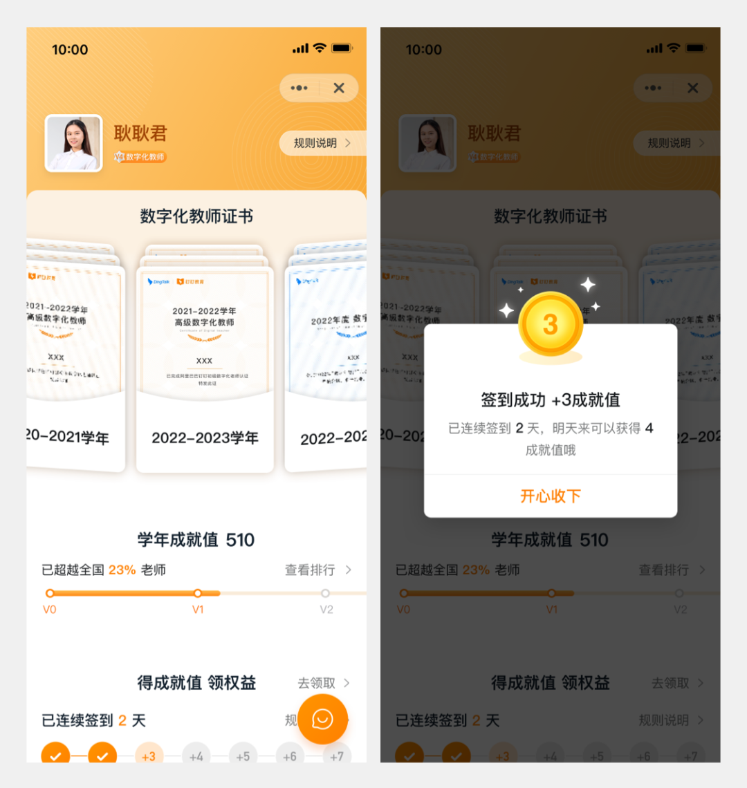 「数字化教师」页面支持自动签到,帮助老师节省时间;增加个人成就值页面的分享能力,可以一键分享给他人;增加意见反馈按钮,持续收集老师对产品的改进建议。
