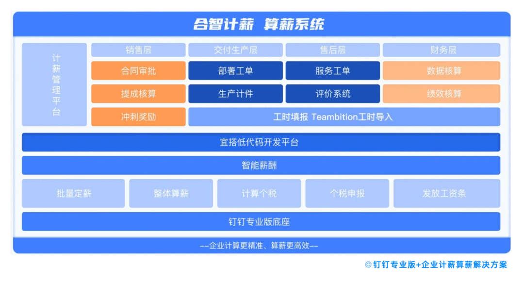 针对这些痛点,钉钉专业版联合智能薪酬、宜搭打造了一套复杂场景计薪算薪解决方案,解决企业销售复杂提成计薪、工时工单计件计薪,有效提升数据精准度、算薪极快。