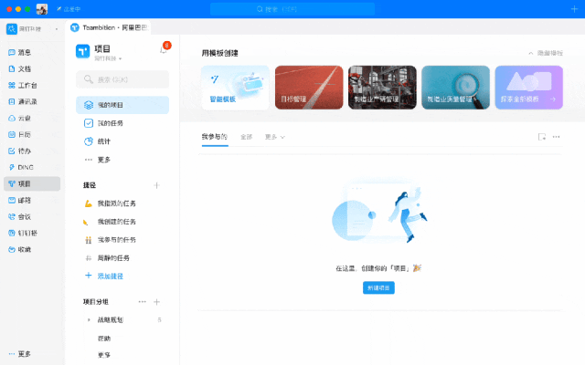 在 Teambition 中,输入一句话,就可以让 AI 帮你搭建一个项目模板,包含了项目需要的各项工作流和任务,降低项目管理的门槛;项目进行过程中,也可以通过 AI 智能生成项目周报、报表。