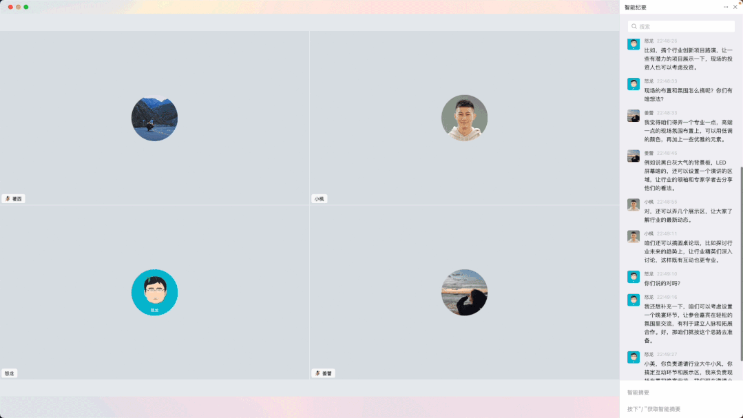会议中需要快速了解会议内容时,用户在视频会议中唤起“/”,对会议内容进行摘要总结,快速了解会议讨论的重点。