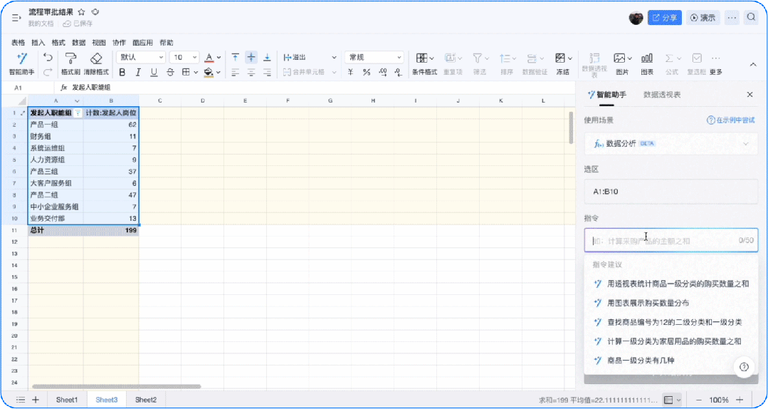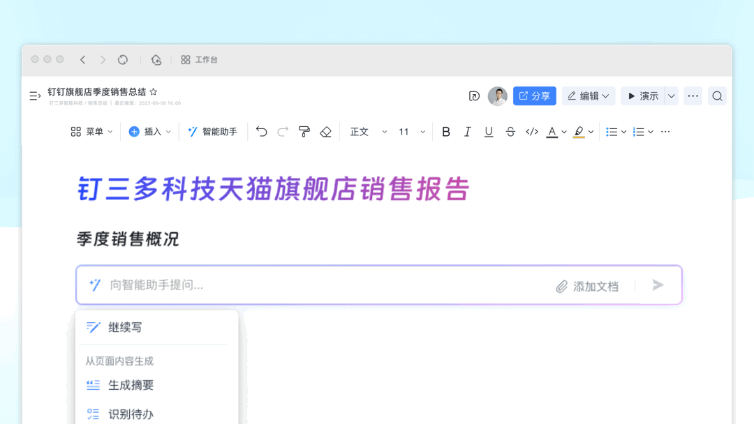 钉钉表格接入斜杠“/”后,基于一份数据量庞大的表格,用户可以像和人交流一样向 AI 提问,获得关于表格数据的重点内容,并且生成相关的数据图表和报告,也可以自动美化。这改变了传统表格的操作方式,用户只需要用自然语言描述需求,降低使用门槛,让更多人成为表格高手。
