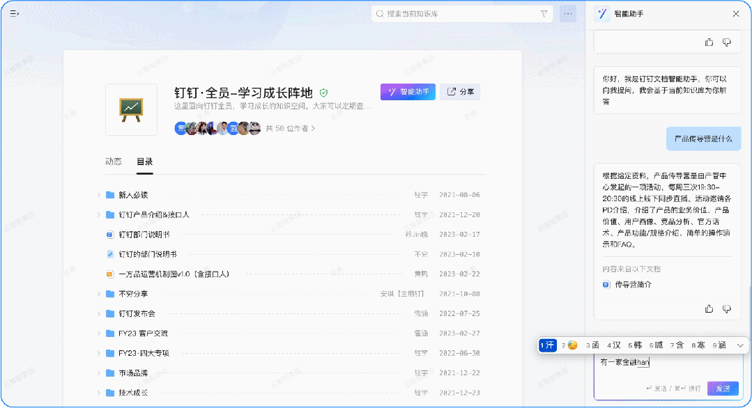 加入智能AI的钉钉知识库可以实现让AI自动学习所有知识库当中的文件资料内容,再在这些资料内容的基础上,自动生成模型。同时,用户可以通过召唤智能AI,并与之对话,随时调出自己需要的资料和信息。知识库当中的资料也可以通过AI进行摘要总结,更能自动定位原文出处。